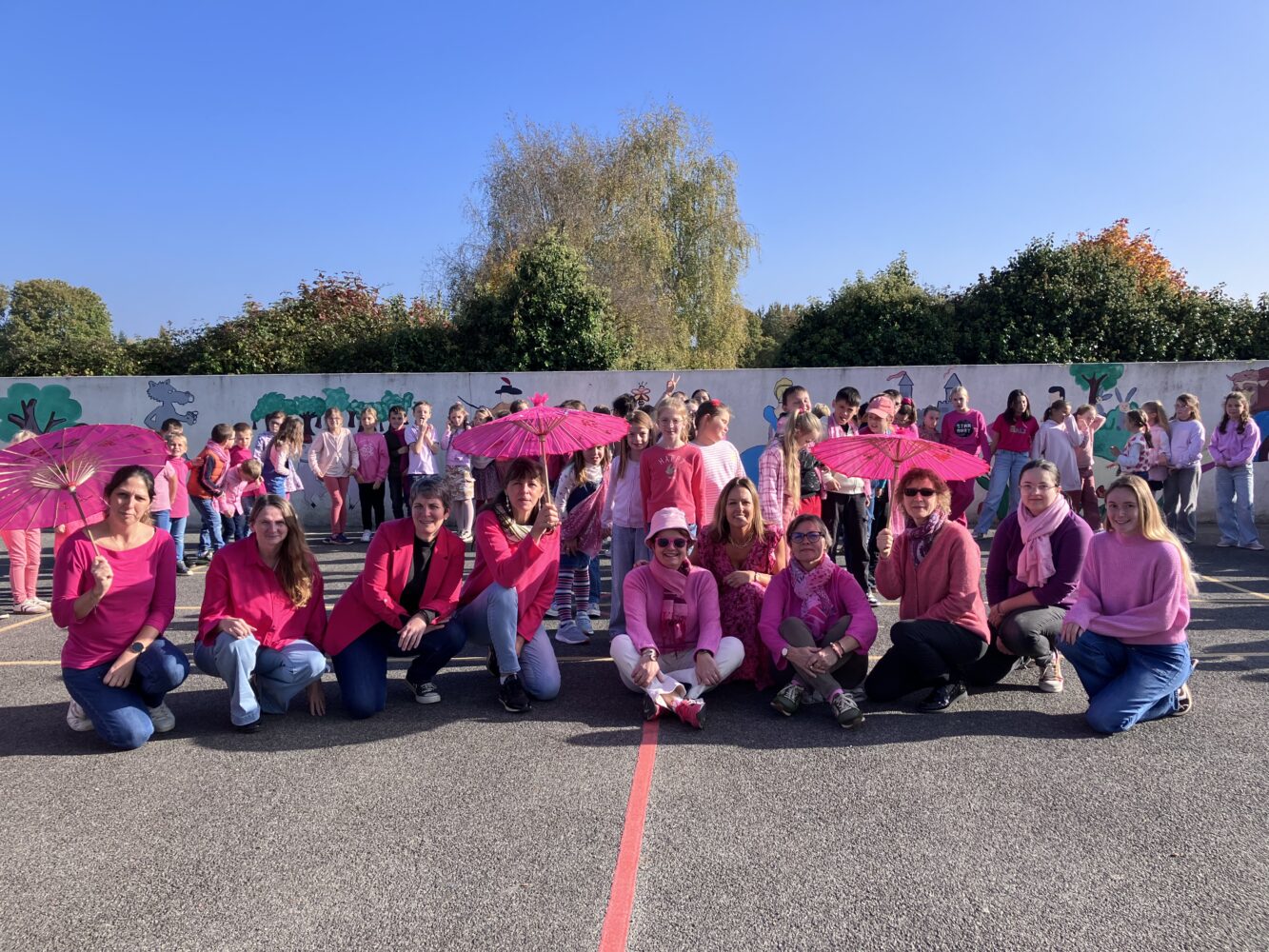 Enfants, enseignantes et personnels se sont unis dans un élan de solidarité, vêtus de leurs plus jolis vêtements roses, symbole d’espoir.